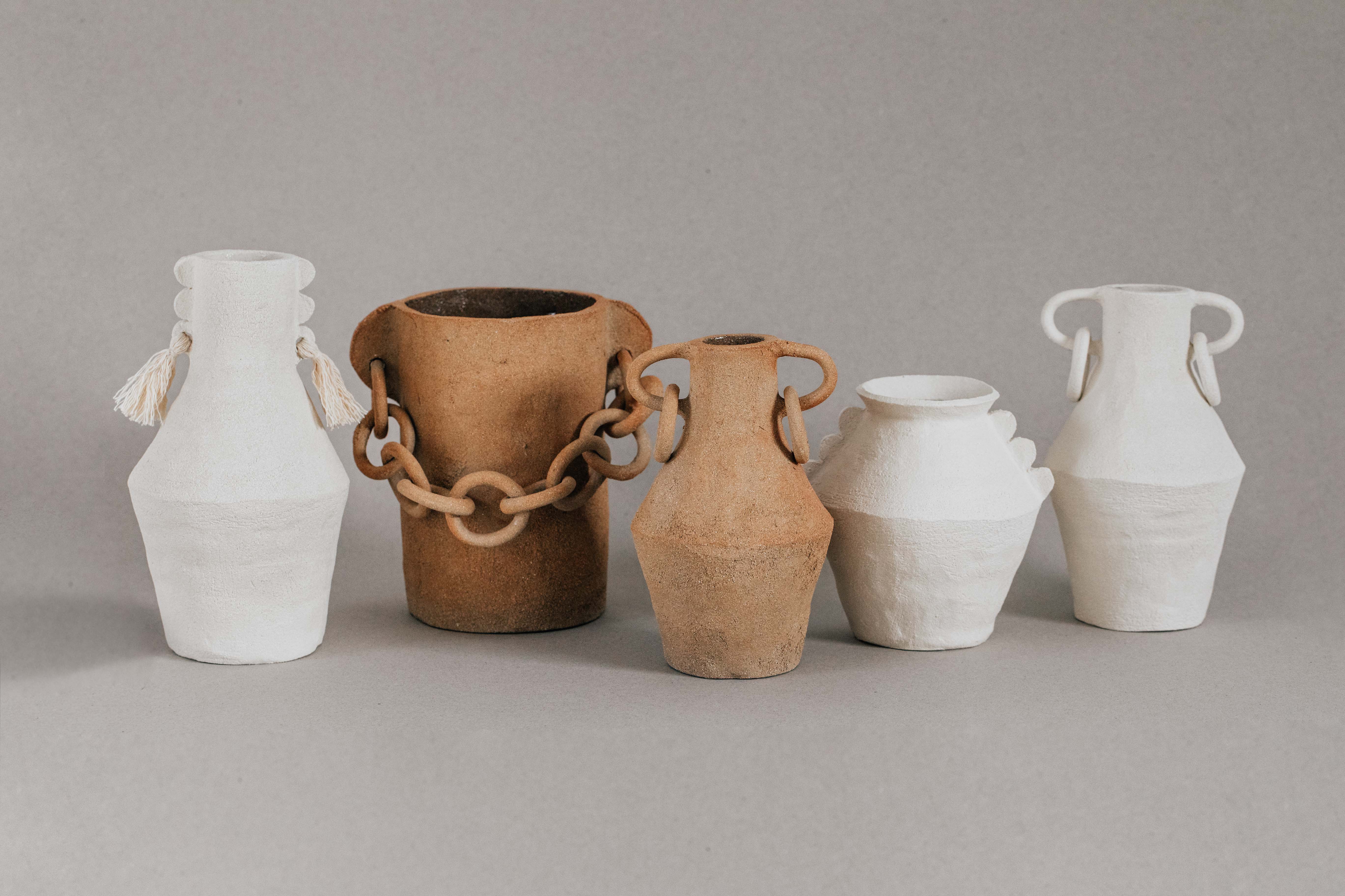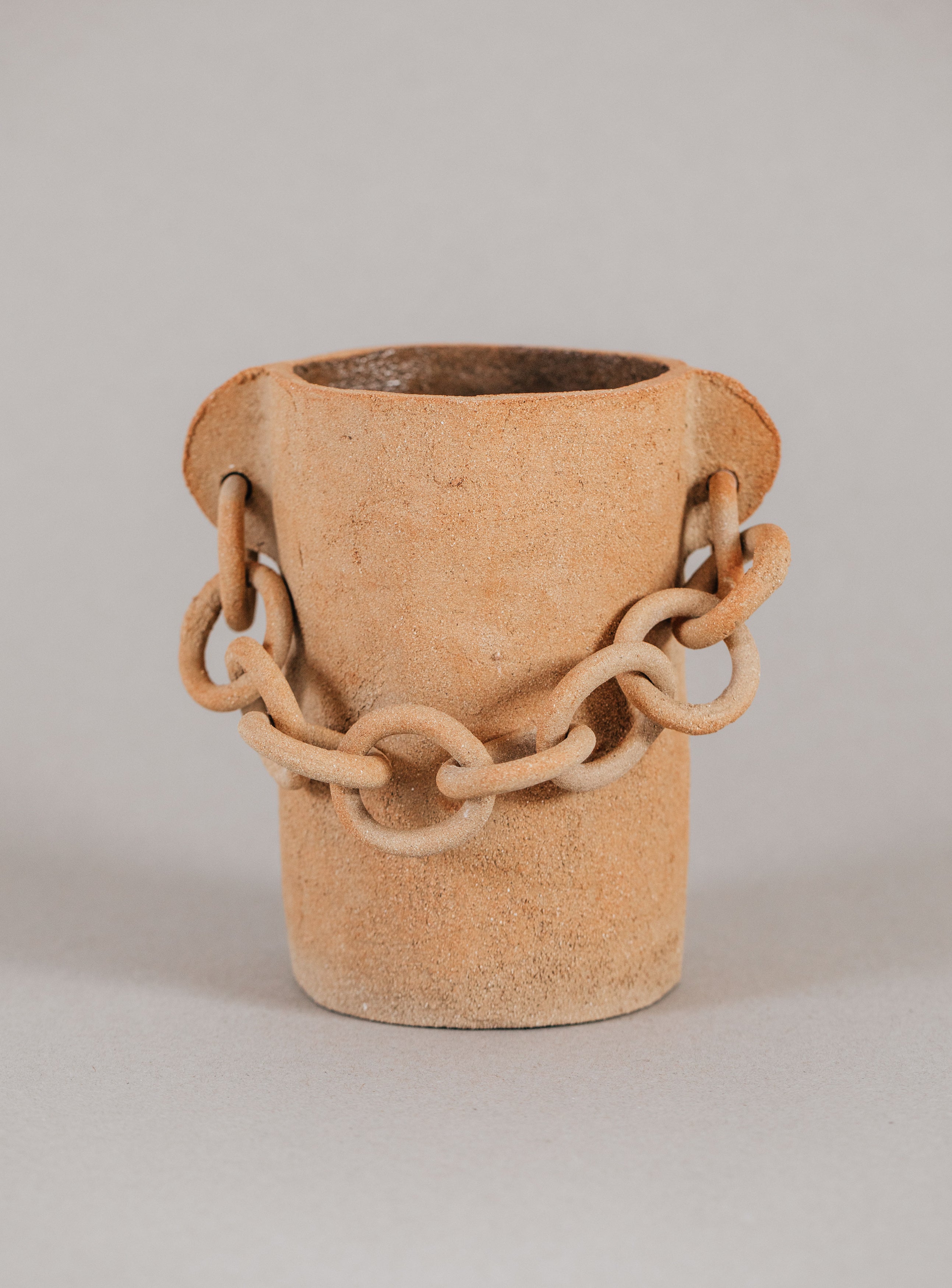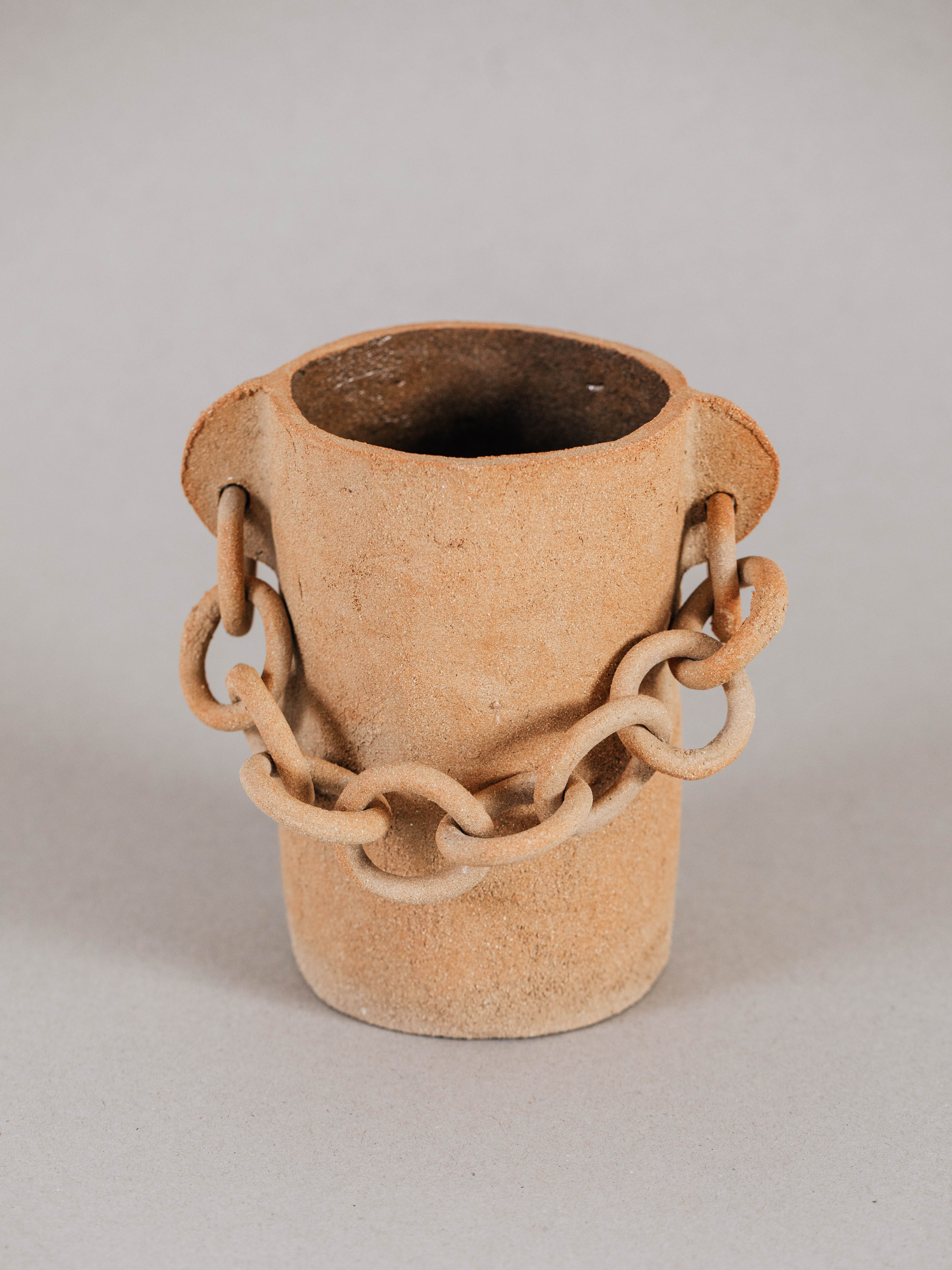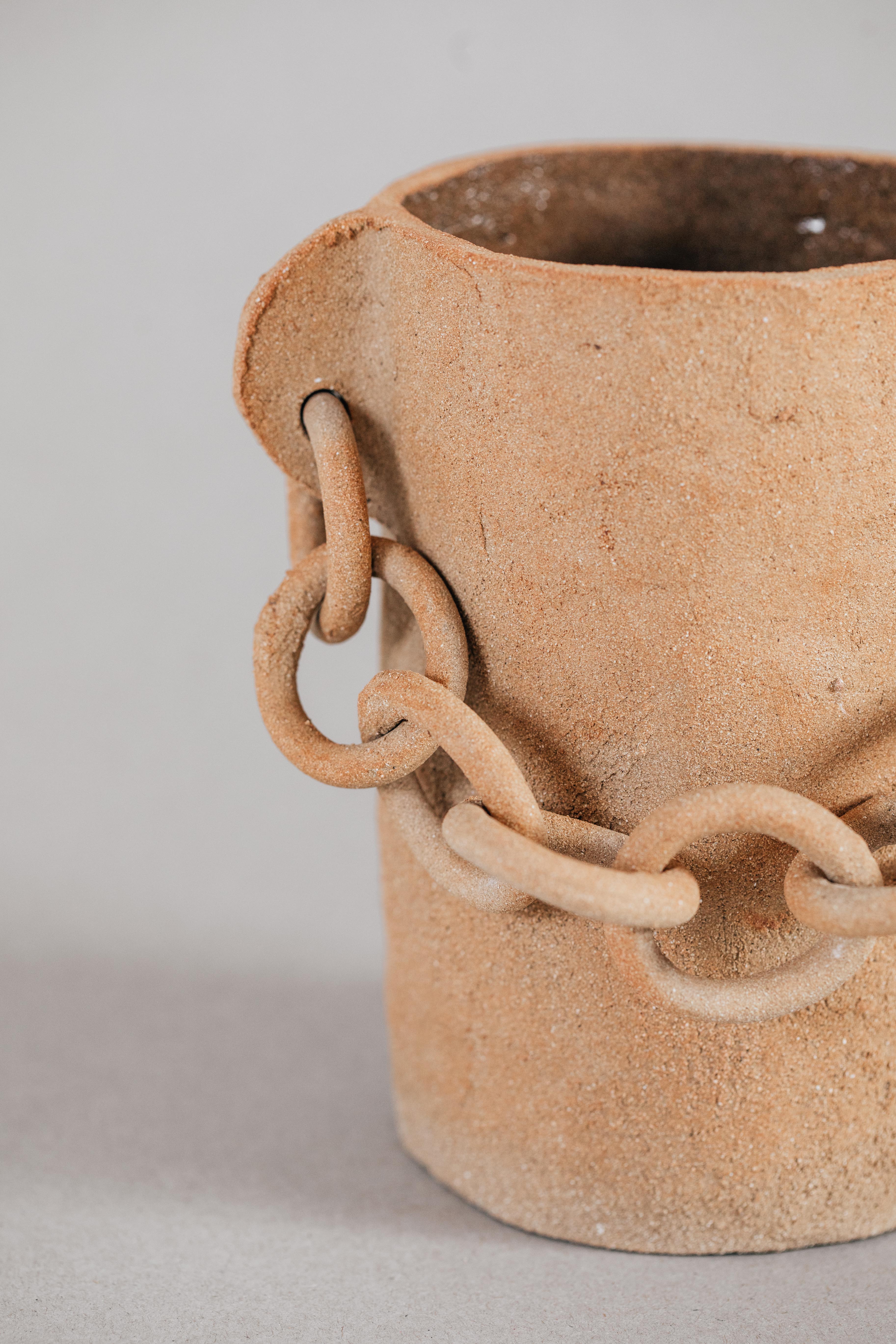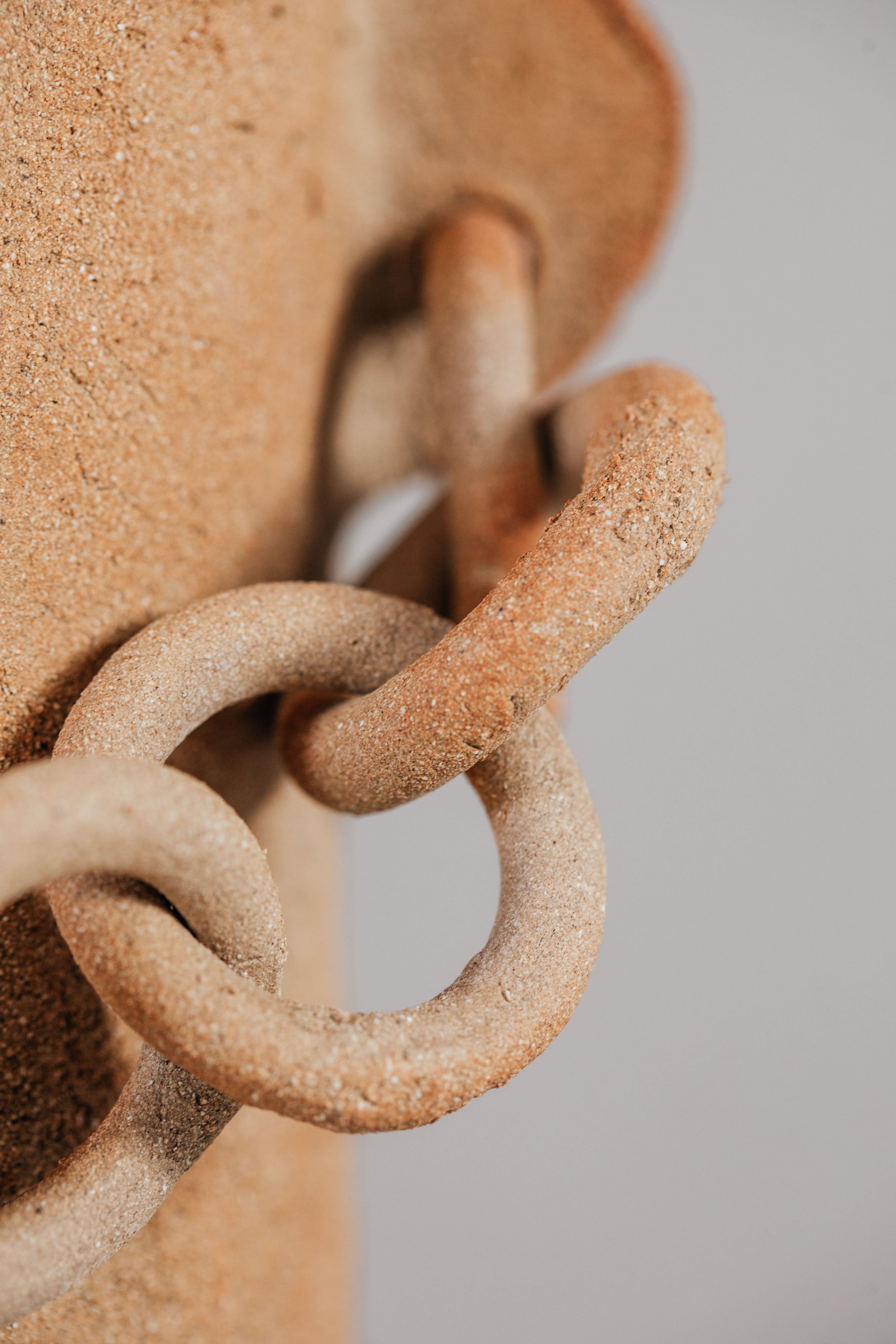 Vase avec chaîne en grès roux chamotté réalisé à la main par une céramiste française.
